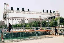 河南某公司舉行十周年慶典,在選定好場(chǎng)地后,工人需要在空曠的廣場(chǎng)上搭建一個(gè)小型舞臺(tái)。小型舞臺(tái)搭建比較簡(jiǎn)單,使用桁架、背景幕布、音響、燈光、地毯、手拉葫蘆等工具設(shè)備。